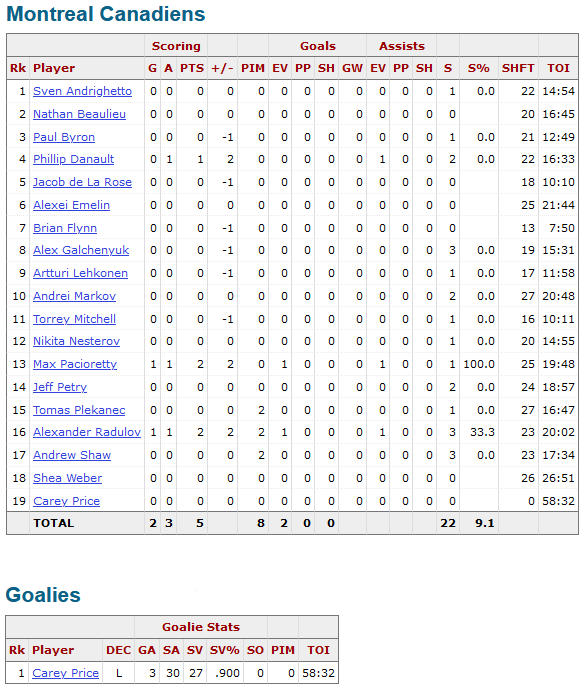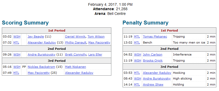Montreal Box Score https://www.hockey-reference.com/boxscores/201702040MTL.html Share this: Click to share on X (Opens in new window) X Click to share on Facebook (Opens in new window) Facebook Like Loading...